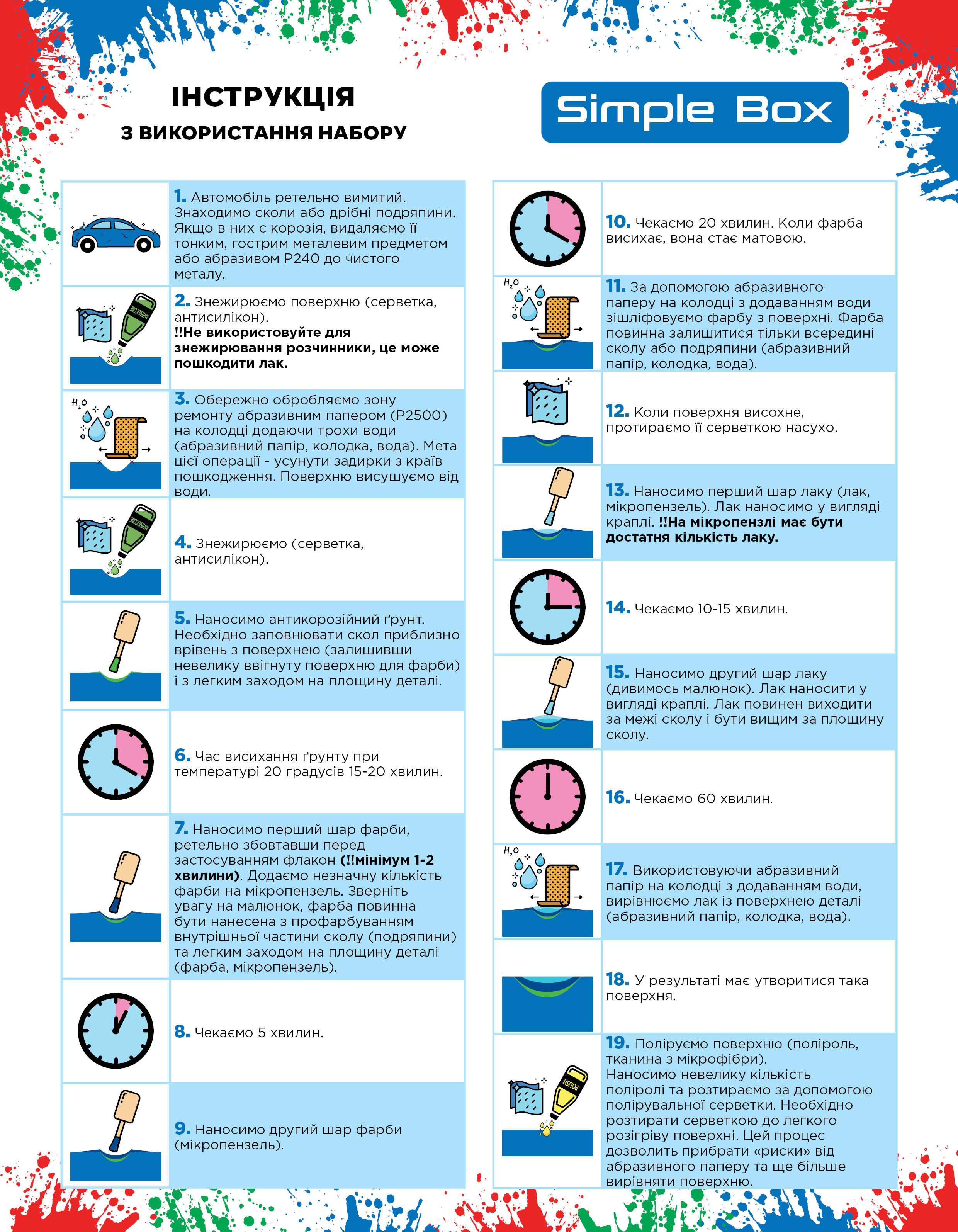 Повна комплектація набору « SimpleBox » для реставрації, що не потребує фінішного полірування. У набір входить : фарба в олівці, грунт, лак 1К, мікрокисті , антисилікон , розчинник, папір наждачний, серветка TORK, рукавичка, колодка-гумка, тест карта, інструкція.